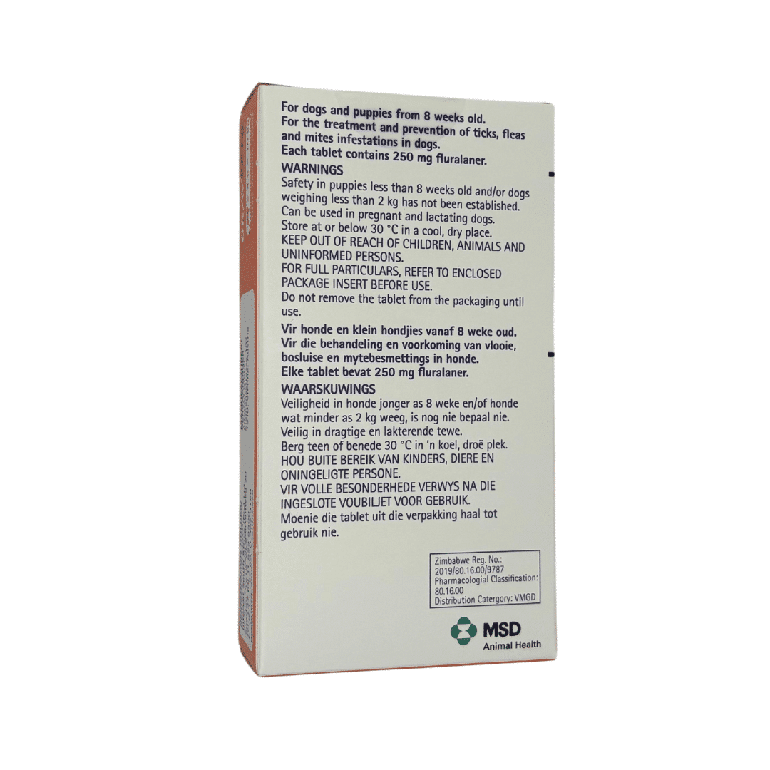 BRAVECTO is safe, fast-acting and family-friendly. *Protects 3 times longer with just one chew that has a flavor dogs love. *Starts killing in 2 hours and continues to kill fleas and ticks for a full 12 weeks. *Works from the inside so it won’t rub off on children or furniture. *Can be used as in antegral part of flea allergy dermatitis treatment. *Safe in dogs with the MDR1 gene deficiency (eg collie type breeds) * Safe for puppies from 8 weeks of age. *Safe for lactating and pregnant dogs *Effective and easy to give – one tasty chew! Effective for Dermadectic Mange