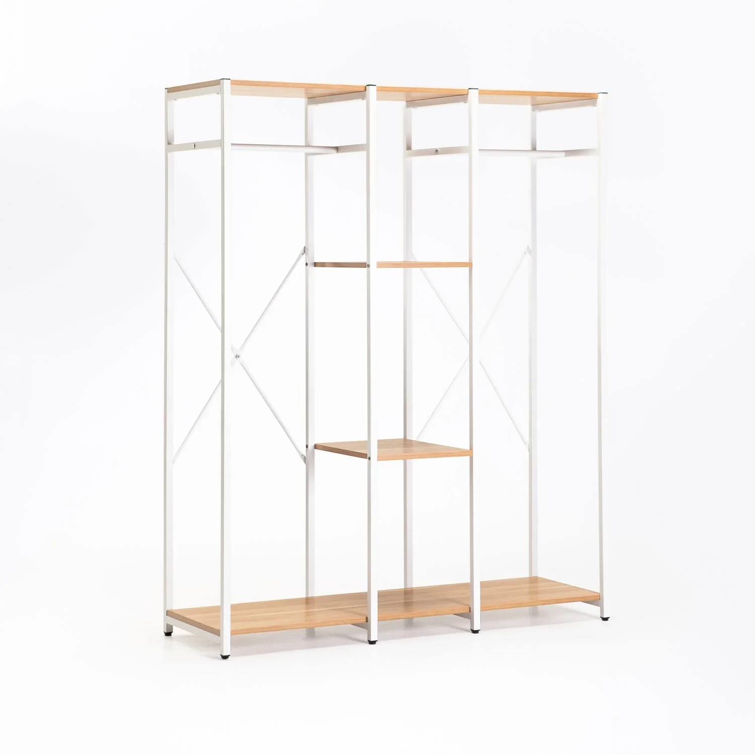 The Kit Multi Shelf & Hanging Open Robe is a contemporary storage masterpiece, designed to cater to your wardrobe needs with style and flexibility. Its strong metal frame paired with the warmth of manufactured wood shelves offers a modern aesthetic. This versatile piece can be customised to fit your space, with the choice of assembling it on fixed feet or adding wheels for easy mobility. The multiple shelving options, along with the hanging space, make it an ideal solution for organising clothes and accessories in any contemporary home