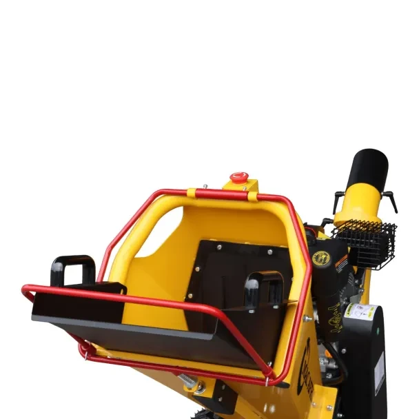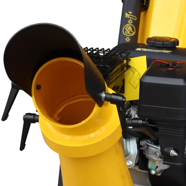 An Efficient landscaping tool designed to simplify your garden maintenance. Featuring a powerful Loncin G200F engine with a displacement of 196cc, this wood chipper delivers a net power of 6.5 horsepower, making it capable of chipping branches up to 100mm in diameter. The recoil start mechanism ensures easy operation, while the drum cutting method, equipped with two blades and one anvil, provides consistent and effective chipping. For safety, the machine includes an emergency stop bar and button. Mobility is effortless thanks to its 4.10/3.50-4 pneumatic wheels, and the adjustable deflector allows you to direct the outgoing debris precisely. The wood chipper’s solid front support foot guarantees stability during operation.