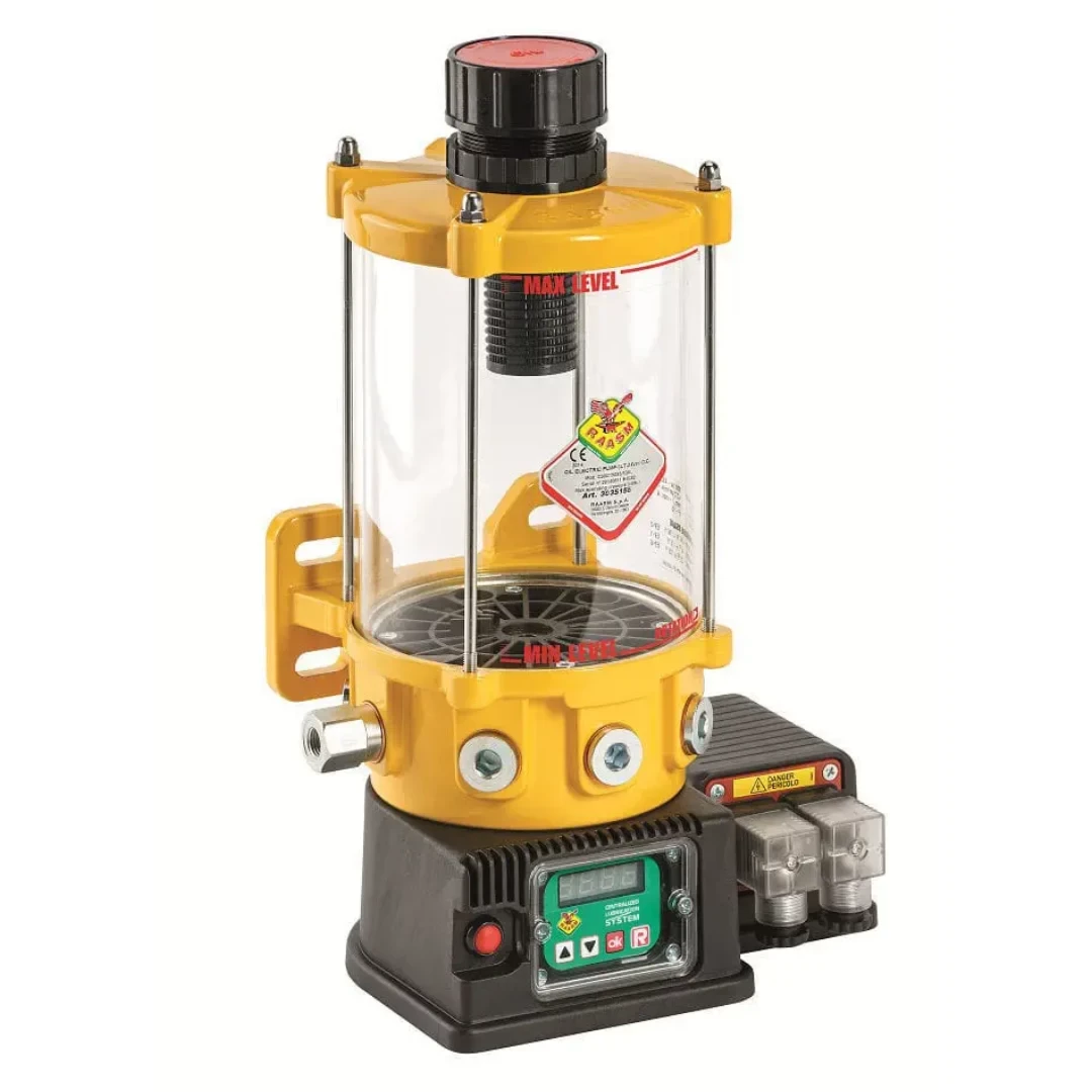 8L Grease Pump. Sturdy and compact electric pumps with shockproof plastic cover for IP55 protection, ideal for stress work environments. Pumping pistons are radially placed in the aluminium basement below the lubricant reservoir.