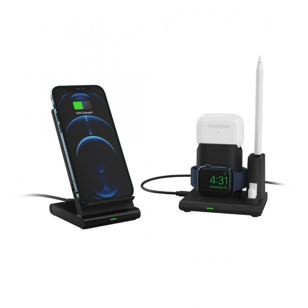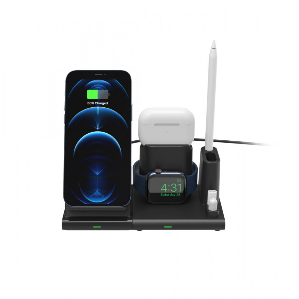 ・ 4-in-1 Fast Wireless Charging station, designed for simultaneous charging of multiple Apple and Android devices.
