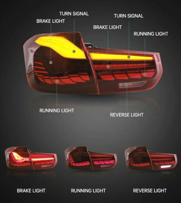 -Premium Quality BM M3 CS OLED Style LED Tail Lights Finished With With Dynamic Turn Signals & Flowing Park Lights Boasting An Excellent Fit. Giving Your F30 The Ultimate Look It Deserves.