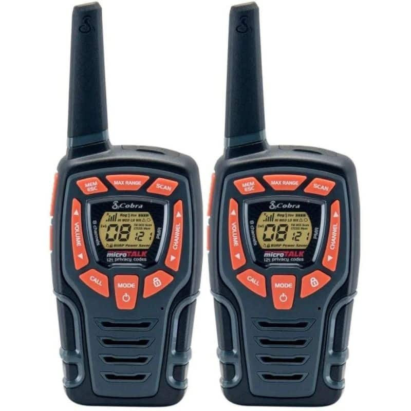 The Cobra AM845 2-Way Radios feature a 10 km range, ideal for travel, touring or security. Micro-USB cable, dock charger & rechargeable AA NiMH batteries included. May also be used with AA alkaline batteries.