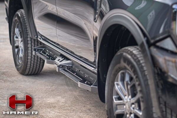 Shadow Series Side Steps for the Ford Ranger Next GEN 2022+ have been designed and developed to enhance the look of this car. These are not rock sliders but are an upgrade to the factory steps with 6mm thick ladder legs that firmly attach to the car using the existing bolt holes.