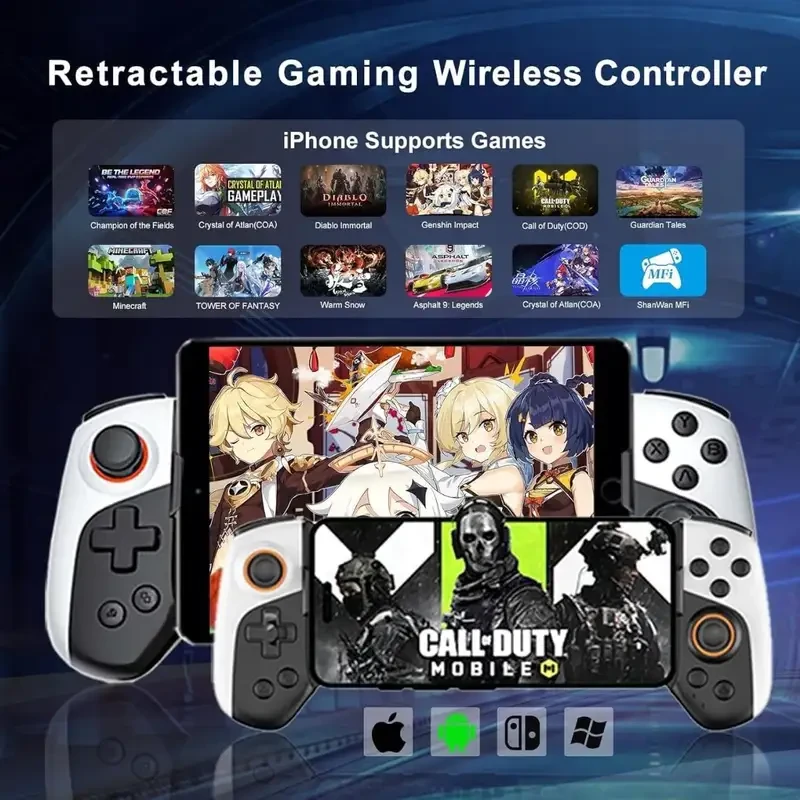 Versatile Compatibility: Elevate your gaming experience with the Retractable Gaming Wireless Controller, the ultimate mobile gaming controller. Seamlessly connect to a variety of devices, including iPhone, Android, PC, Nintendo Switch, and Apple Arcade, for gaming on the go like never before! Ergonomic Design: Enjoy comfort and control with the ergonomic design and responsive buttons of this controller. Its retractable feature allows for compact storage and portability, making it the perfect companion for your gaming adventures, whether battling foes in action games or exploring virtual worlds. Three modes in one machine:Easily switch between Standard Mode, Nintendo Switch Mode, and Direct Play Mode to adapt to various gaming scenarios. Enhance your gameplay experience with versatile options tailored to your gaming needs. Wireless Freedom: Enjoy wireless gameplay with a range of up to 33 feet (10 meters) for unrestrained movement. Made with high-quality materials, this gaming controller offers durability and precision for hours of uninterrupted gameplay. Say goodbye to lags and delays - the Retractable Gaming Wireless Controller ensures a smooth and immersive gaming session every time. Long Battery Life: Rechargeable battery provides up to 8 hours of continuous playtime on a single charge. Immersive FeedbackExperience immersive feedback with the symmetrical 3D vibration motor! This feature delivers speed shock and multiple sensations, adding realism to your gaming adventures. Feel every action and movement as you dive into the gaming world.