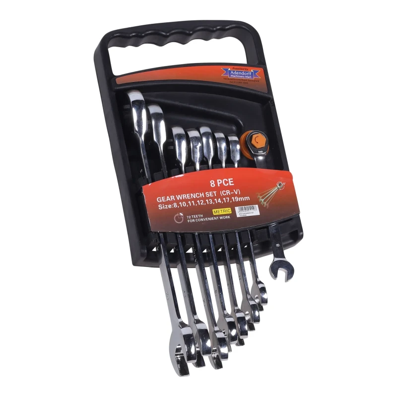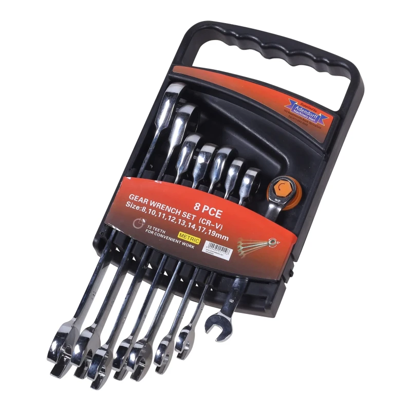 Sizes: 8, 10, 11, 12, 13, 14, 17, 19 mm. CR-V Metric Set. Drop forged heat-treated steel construction. Durable chrome-plated finish resists corrosion. 72-teeth chrome vanadium ratcheting box end. Works in tight spots without re-positioning. Tool Standard: GB/T4393-2008. Material: 45# carbon steel.