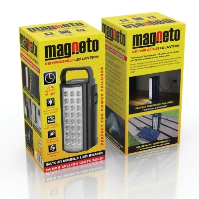 Rated up to 1000 lumens* beating load shedding was never this easy. Were here to help shed the load of stress and inconvenience with our Magneto LED Lantern. With up to 60 hours of light on one single charge, it is definitely the Number One, most powerful and perfect handheld LED lantern in South Africa! Powerful 1000 lumen LED lantern Automatic switch on during power outages when plugged into a wall socket Up to 60 hours of light on a single charge! 2 Modes: Power-Saver and Ultra-Bright Perfect for studying, camping and more! Built-in discharge and overcharge circuits for battery protection. USB port to charge your mobile phone. Onboard power cord and wall-hanging mounts. Solar panel compatibility. 6 months 1 light