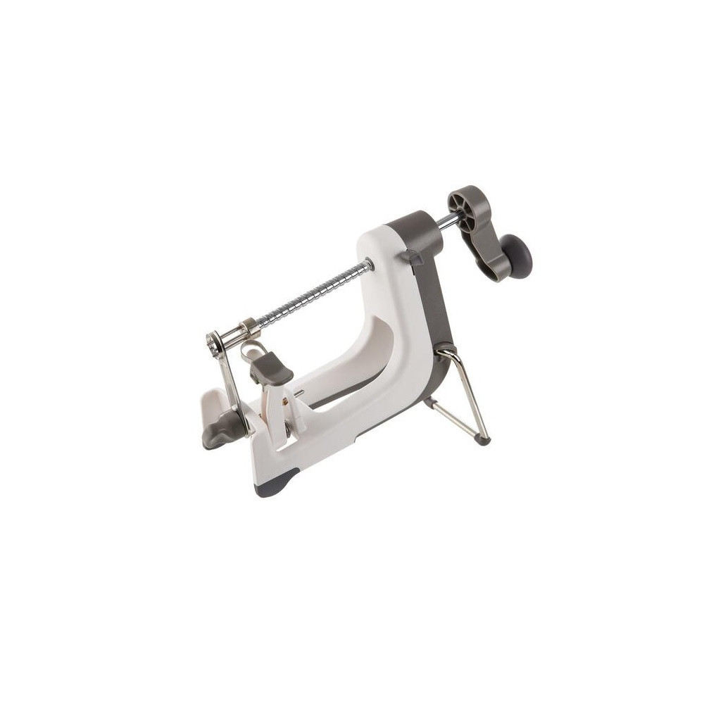 Effortlessly prepare large batches of apples with apple machine. The innovative, angled design eliminates the need for a suction base or mounting hardware. Simply place on the counter top, and with a few, simple twists of the rotating handle, you can core, peel and slice your apples in seconds. The non-skid feet securely hold the machine in place during use, and the convenient quick release lever removes the perfectly symmetrical slices of apple from the solid stainless steel prongs. Release the core by pulling back on the handle and voila, your work is done.