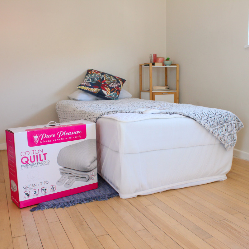 a long-standing, expert and trusted South African brand • Keeping South Africans warm for over 40 years • Can there be anything better than getting into a pre-warmed bed on a chilly winters’ night? • We make our electric blanket to keep you warm and cosy, where you need it, during the cold winter nights • The safe, energy efficient and most cost-effective way to stay warm and comfortable this winter • It uses a minimal amount of electricity • Luxurious 100% Cotton Quilt outer fabric provides superior comfort • Manufactured to international standards • Designed to be used on queen size beds • Dual controllers for individual comfort choice • While an electric blankets is a very cost-effective way to heat your bed, following these 2 steps will save you even more: • STEP 1: Preheat heat the bed on Max Power for 30min prior to climbing under the covers. • STEP 2: Set the blanket temperature controller to level 1 for the remainder of the night. • This way you climb into a toasty bed and remain cozy throughout the night • FEATURES & BENEFITS • Luxurious 100% Cotton Quilt outer fabric provides superior comfort • Elasticated skirt for easy, secure fitting • Outer Material: 100% Cotton – T200 Thread Count – 135gsm wadding • Inner Material: Non-allergenic fabric, 100% Polyester • On/Off indicator light • 2 x Controllers and heating zones for individual control & comfort • 3 Heat settings for personal comfort & all night safety • Safeguard protection against overheating • Economical due to low energy consumption • Meets international safety standards • Machine washable (after removing controller) • 24 Month warranty • TECHNICAL SPECIFICATIONS • Dimensions: 152 x 188cm (WxL) • Bed fit: Elasticated Skirt • Bed size: Queen • Bedside Control: Dual • Input: 2 x 58W heating circuit • Voltage: 220-240 volts • Care instructions: 30 degree gentle cycle wash – after removing controller • WHAT'S IN THE BOX • 1 x Electric Blanket • 2 x Controllers • 1 x Instruction Manual