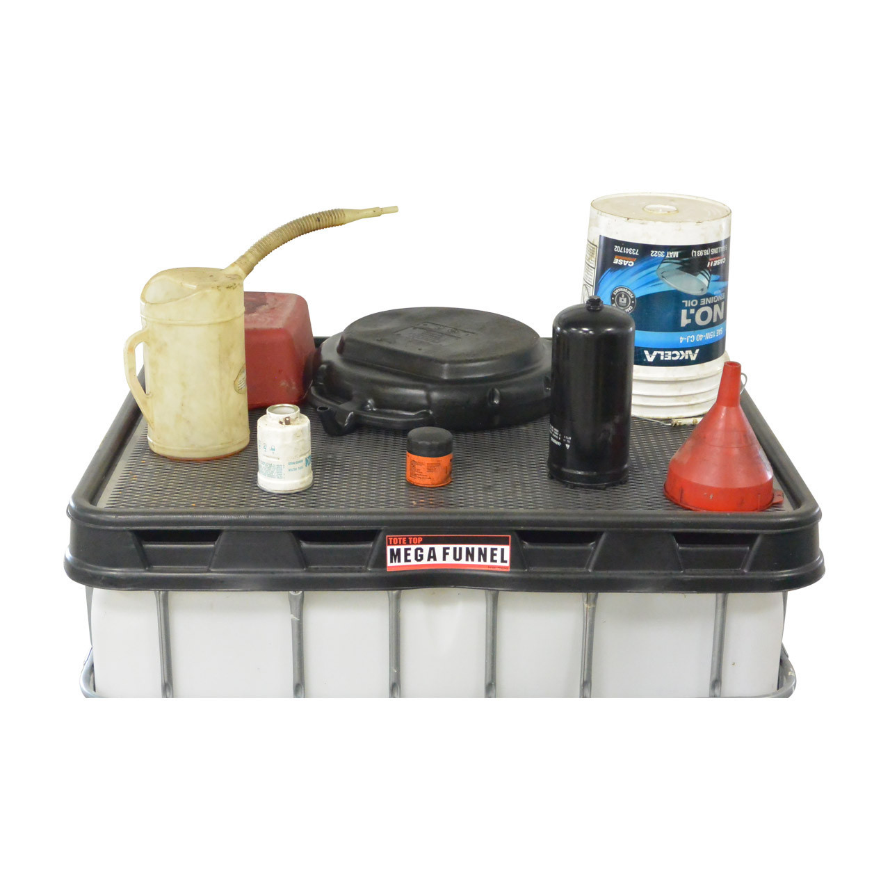 The Tote Top Mega Funnel is a drain oil collection system that simply sits on the top of a tote and holds multiple oil pans, funnels, filters etc., at once so the oil can drain off into the tote without a mess. The Tote Top Mega Funnel fits both 275 gallon and 330 gallon IBC totes.