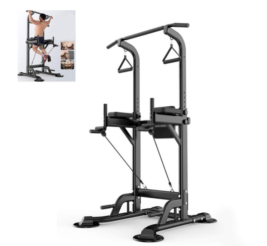 Smart design: the fitness tower offers extra-long support legs and 4 height-adjustable main legs for optimal safety. Crossbars and 4 rubber suction feet provide extra stability.