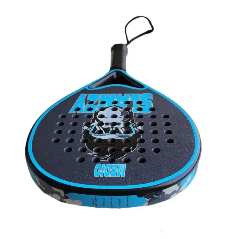 The Slamzy Medio teardrop shaped padel racket has a well-balanced weight distribution between the grip and the head. The Slamzy Medio Padel racket is ideal for an intermediate player looking for more power and high manoeuvrability during play. The carbon frame combined with the Eva core creates a smooth feel off the racket face and provides comfort during the power plays.