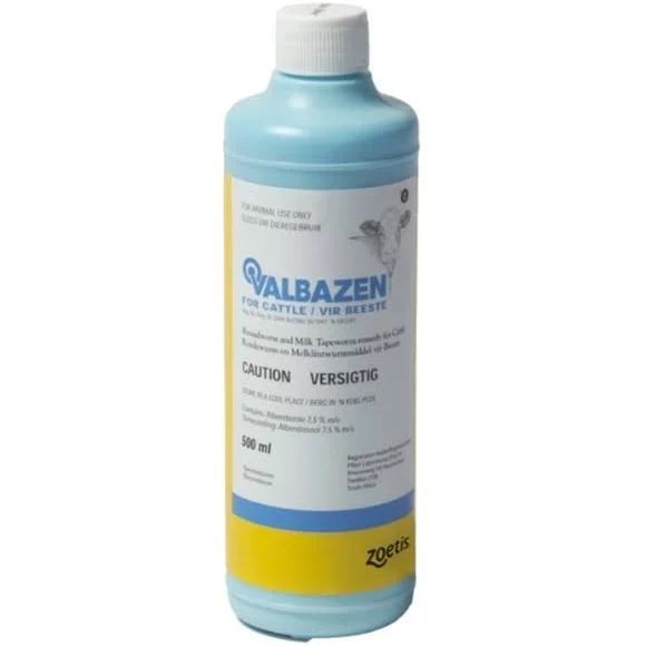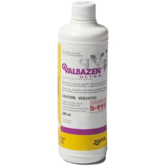 First, dilute 1 part of Valbazen® Ultra to 3 parts of clean water before use. Administer, orally at a dose of 2 ml of the reconstituted Valbazen® Ultra per 10 kg body mass. For liver fluke dose at 2,5 ml per 10 kg body mass (after dilution).